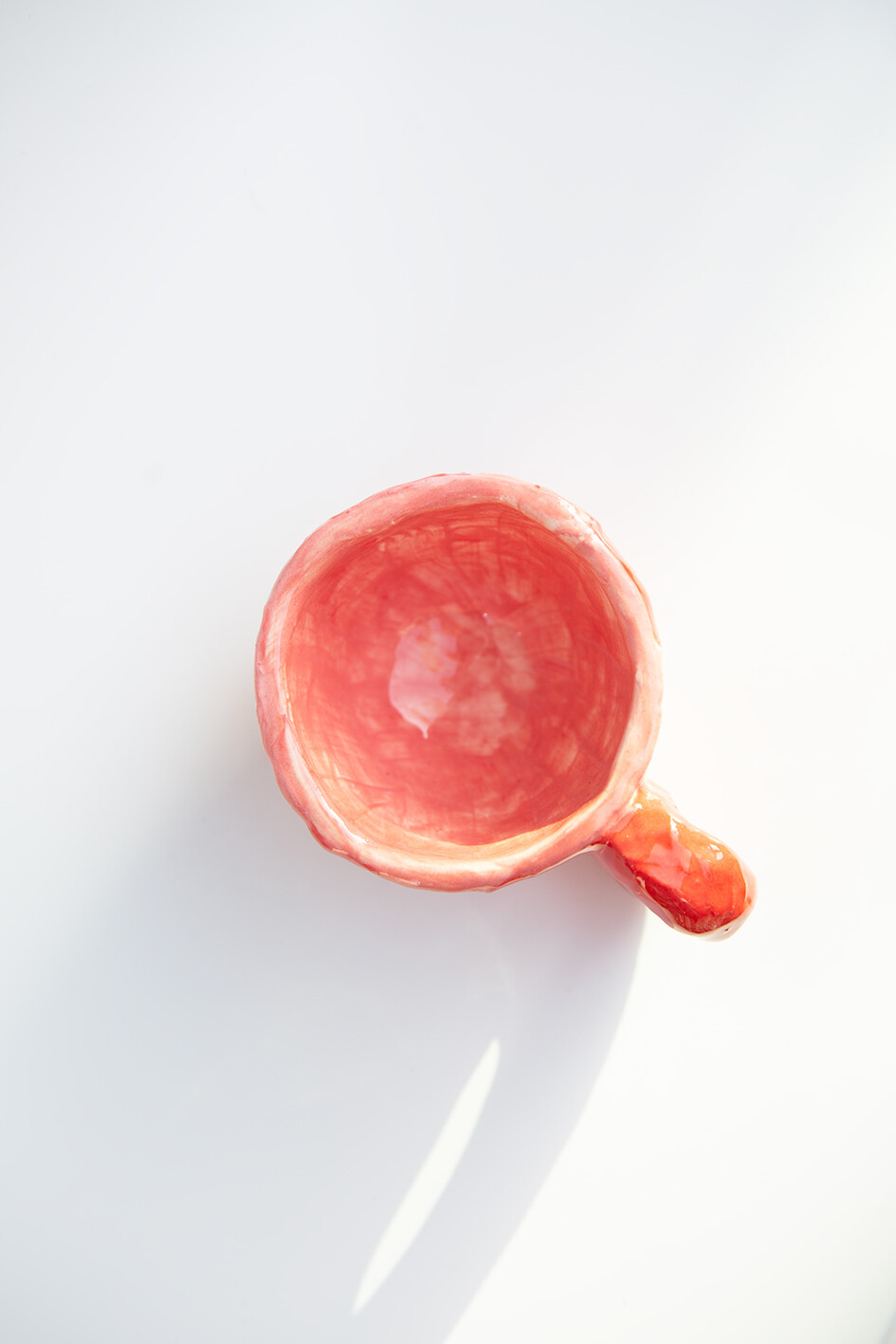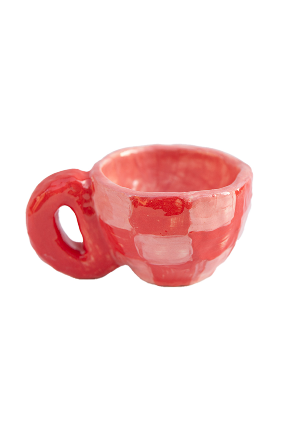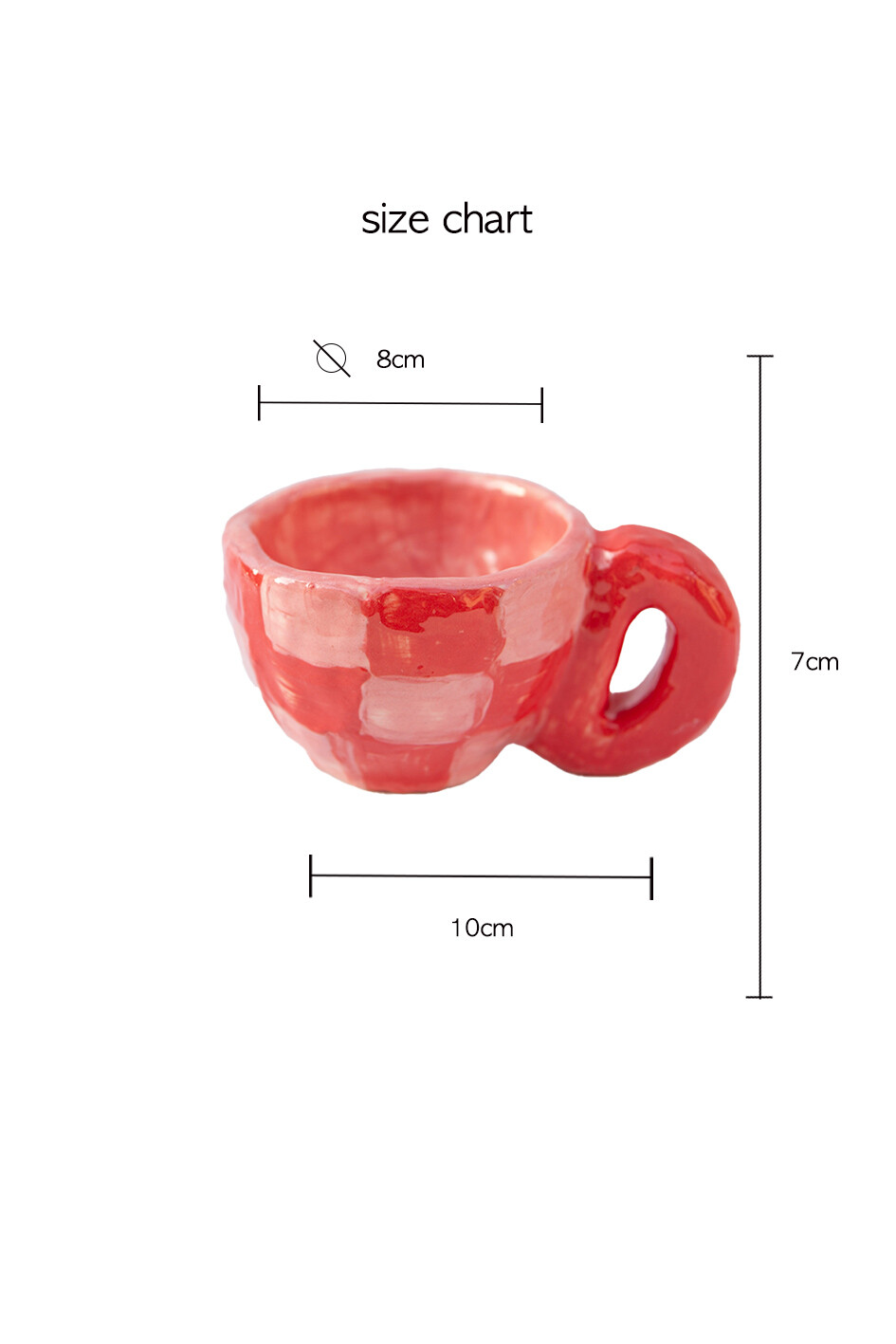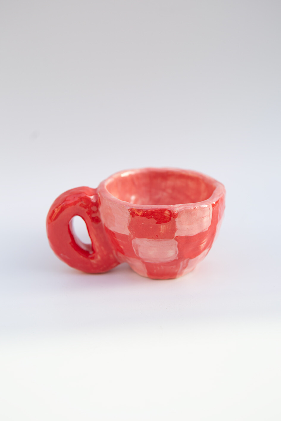 핑크와 레드 컬러 조합의 체커보드 머그컵입니다.