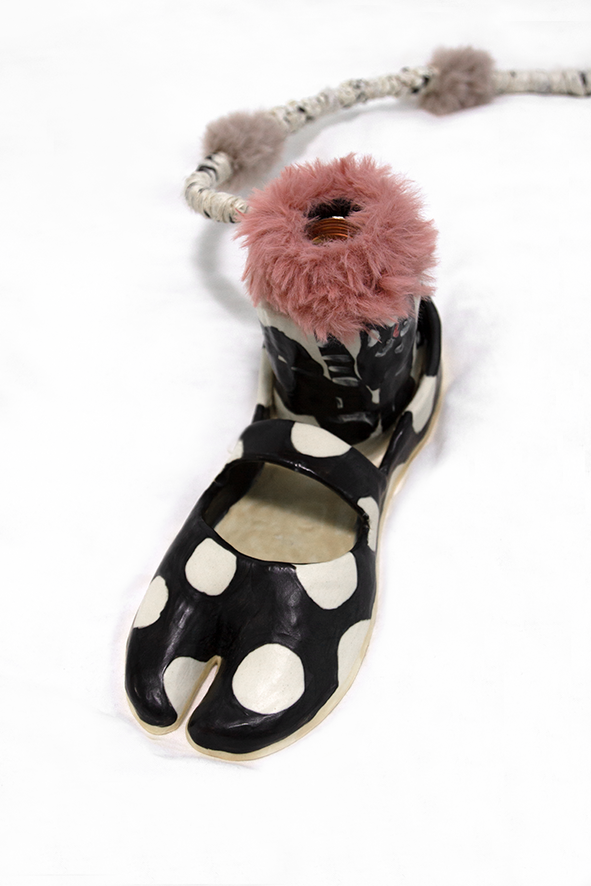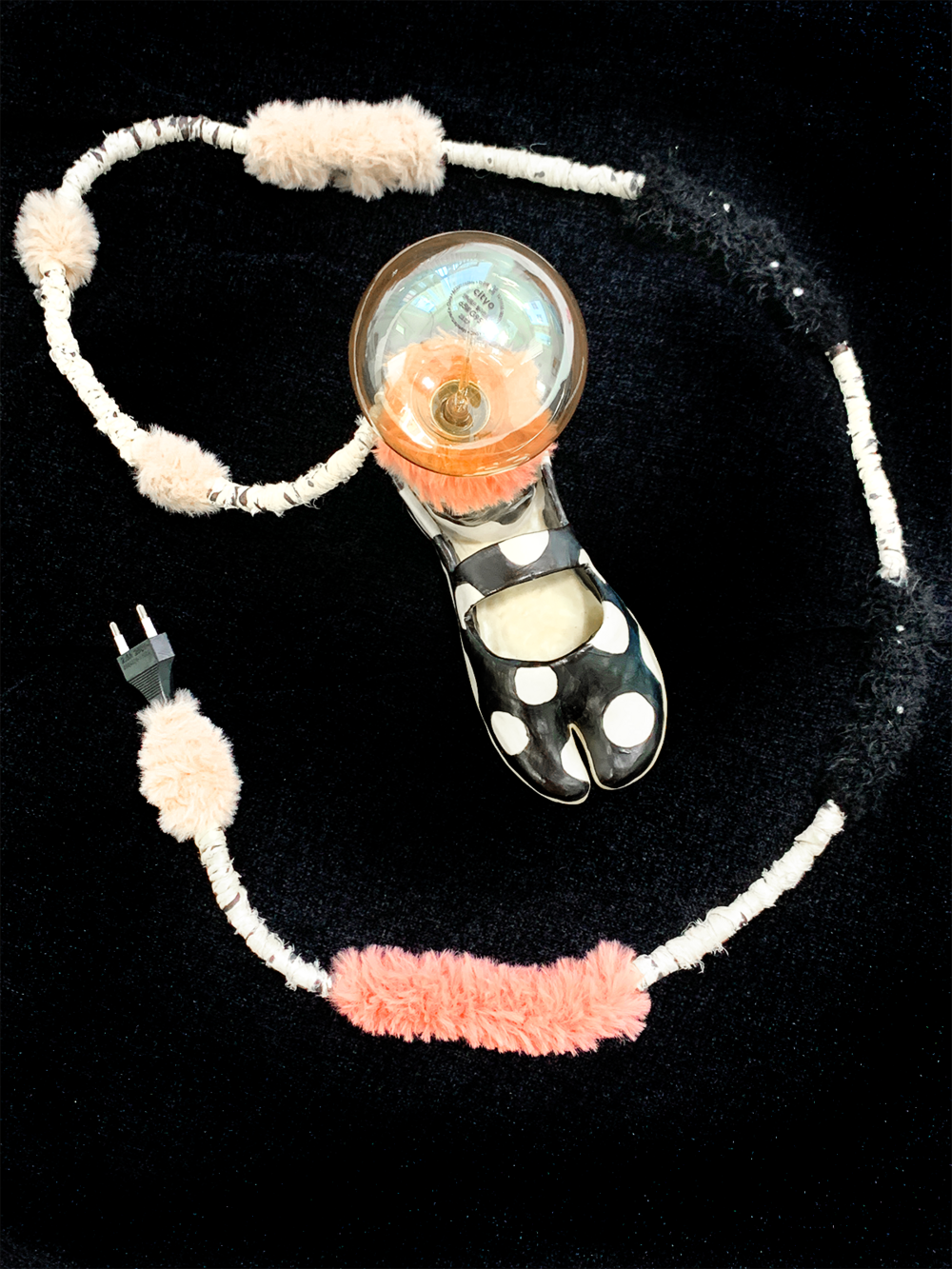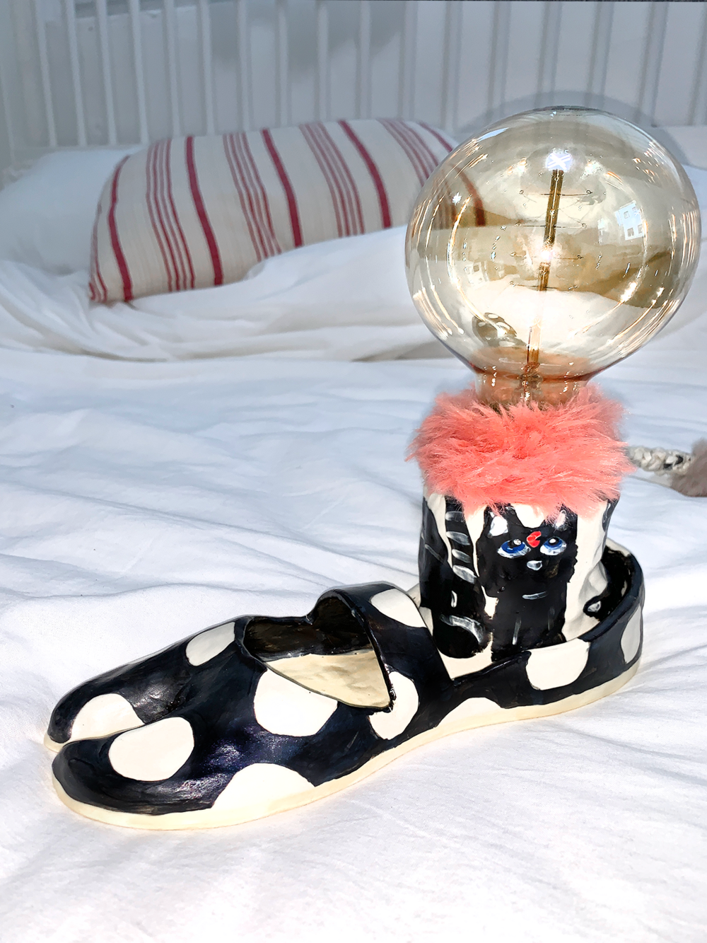 요이지레코드의 느긋한 밤을 즐기는 엉뚱고양이가 프린팅 된 양말과 도트 무늬의 타비 슈즈 형태의 도자기 조명입니다.