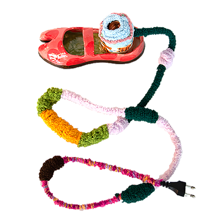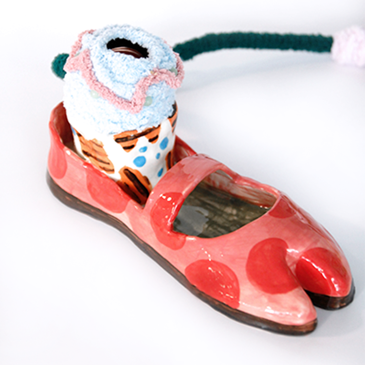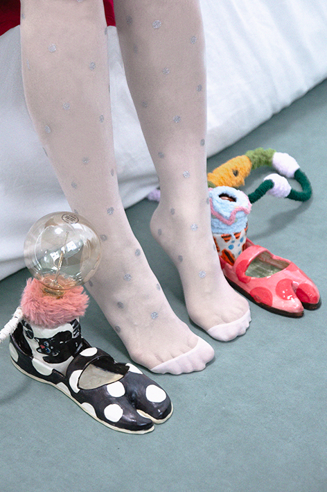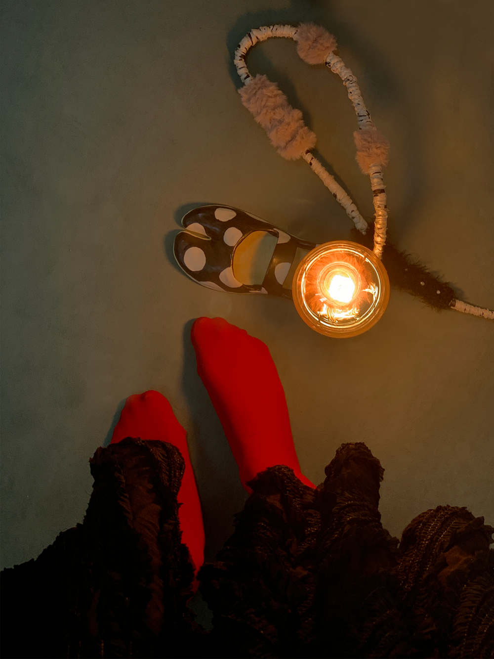 요이지레코드의 느긋한 밤을 즐기는 엉뚱고양이가 프린팅 된 양말과 도트 무늬의 타비 슈즈 형태의 도자기 조명입니다.
