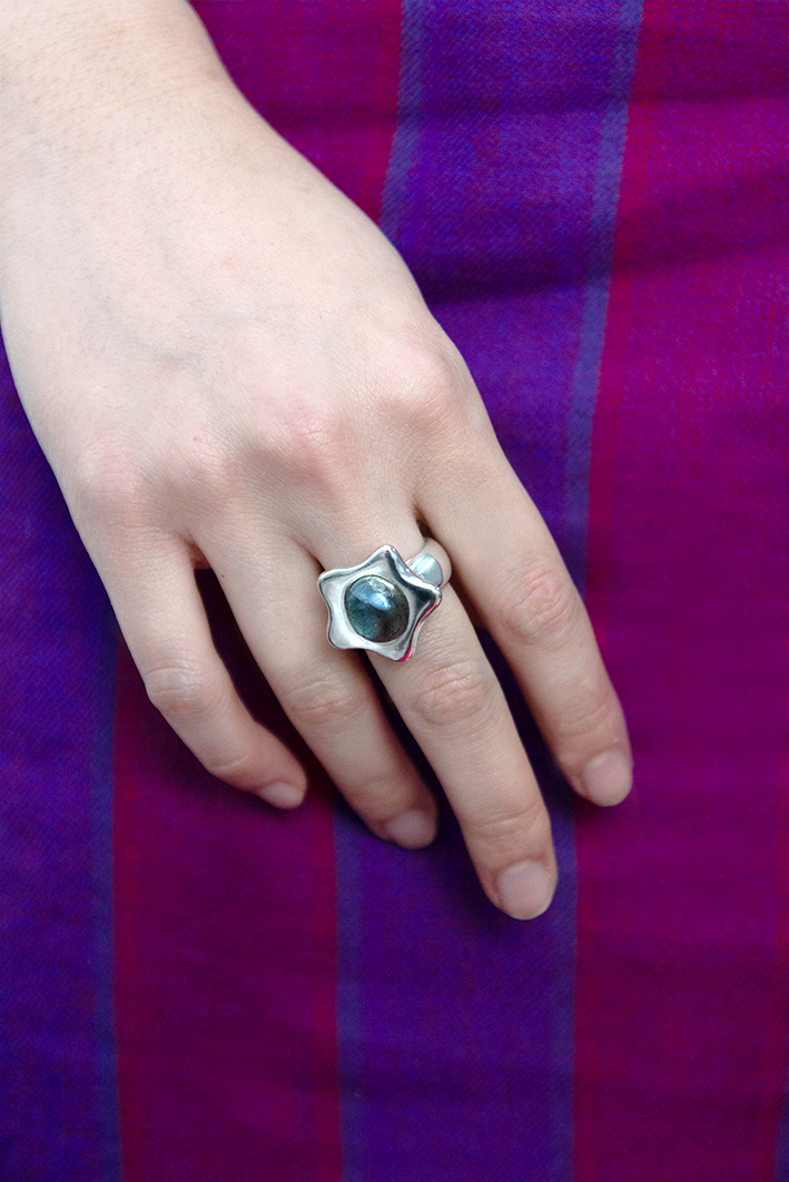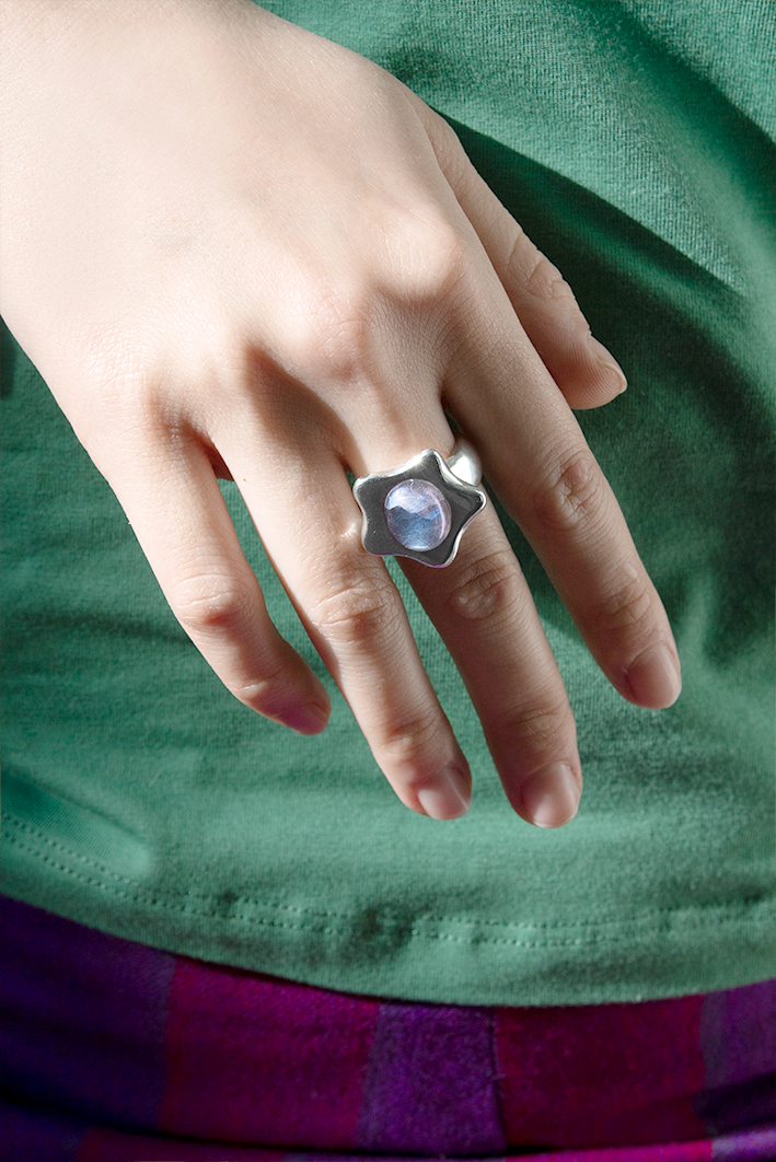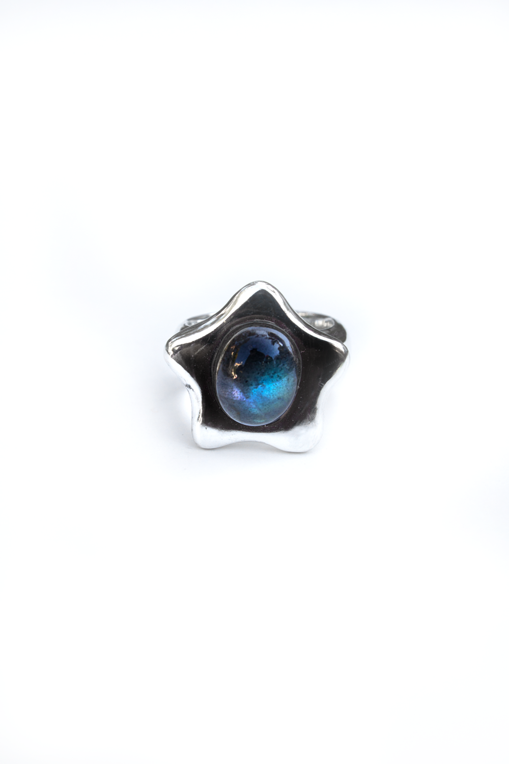 오드아이 고양이의 반짝이는 눈빛이 오묘한 푸른 보랏빛 컬러의 원석이 별 모양 반지에 박혀있는 반지입니다.