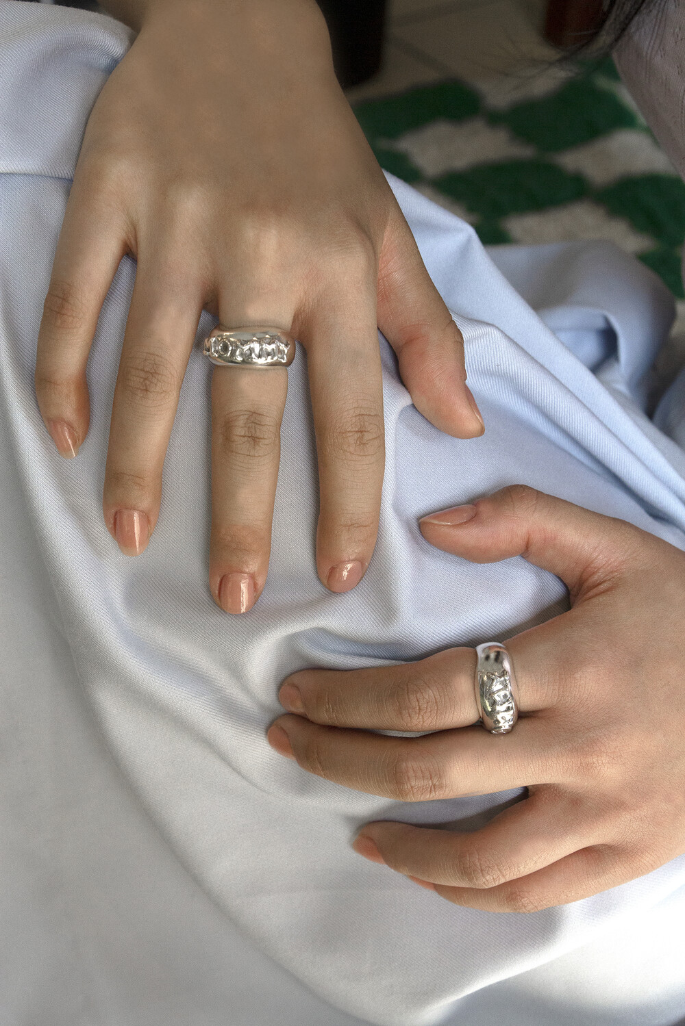 비정형적인 부드러운 형태와 MOMMY 레터링이 새겨진 볼드한 반지입니다.