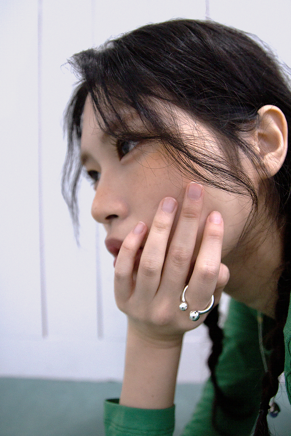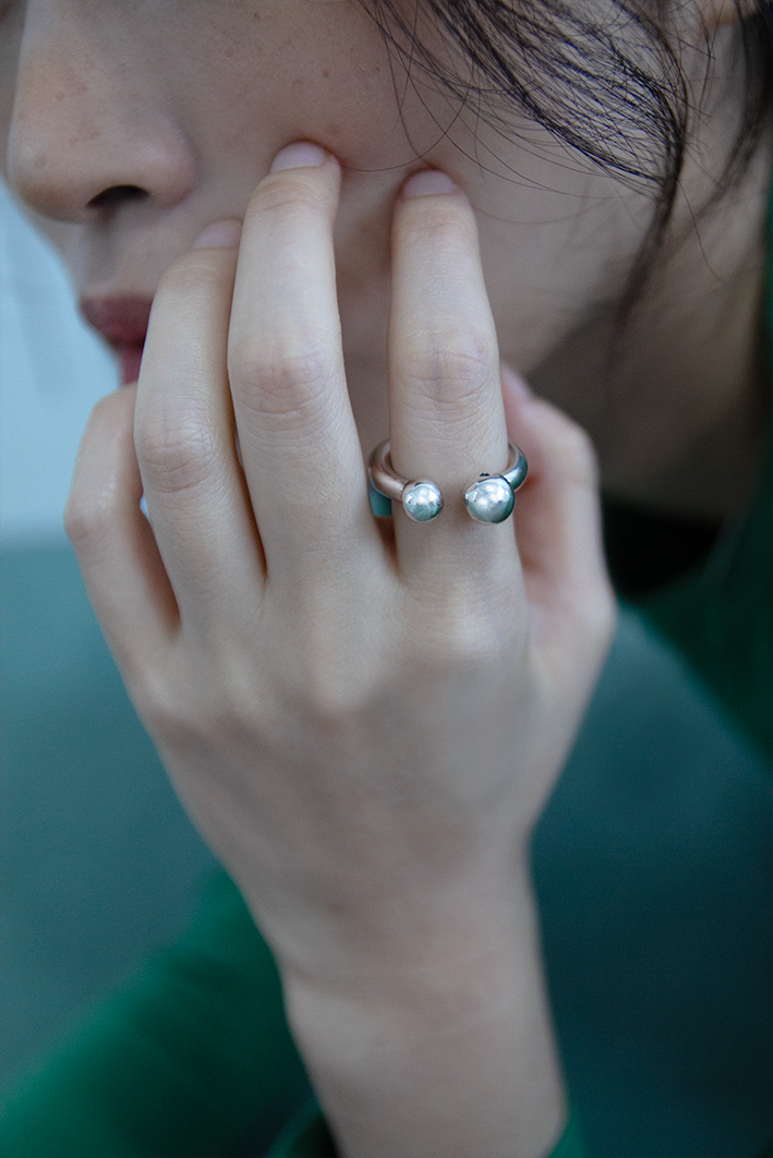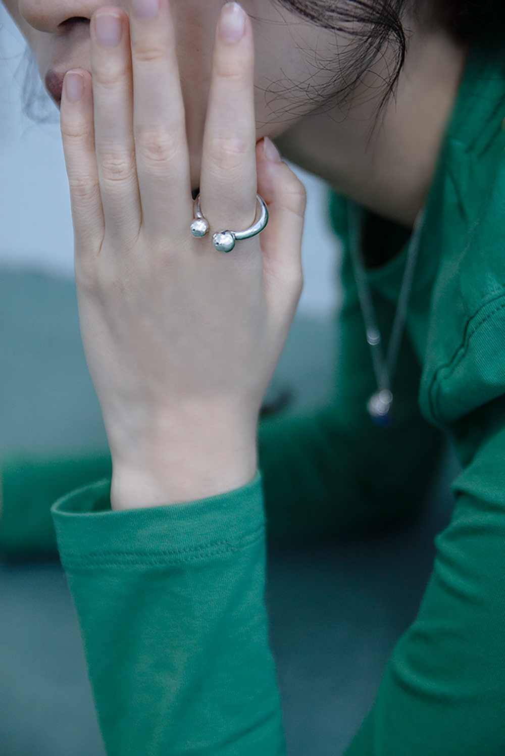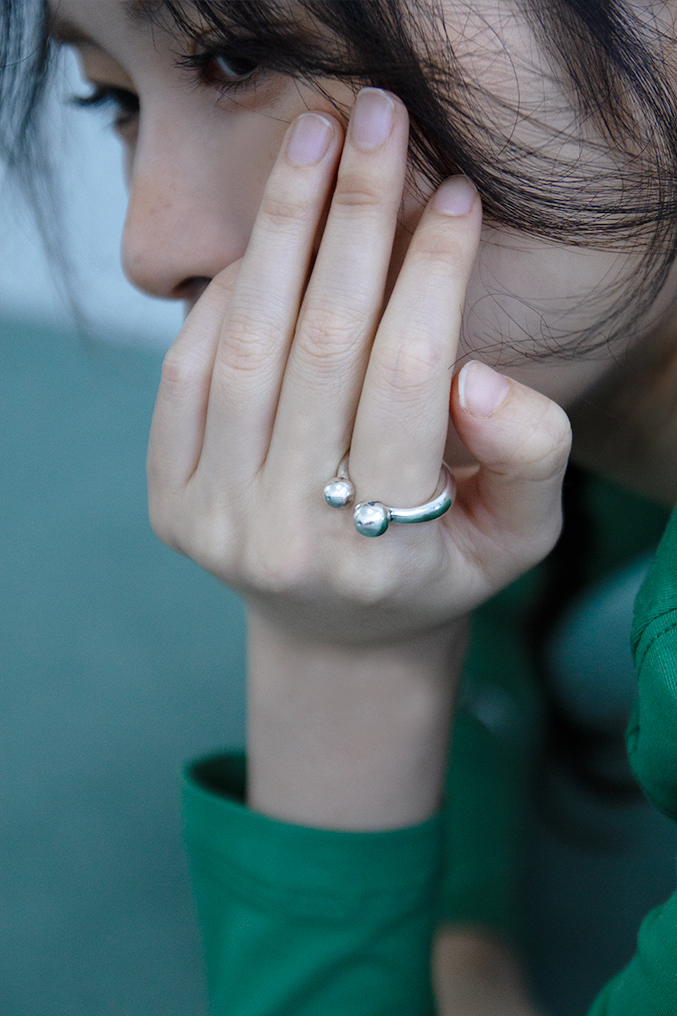 고양이와 딱 어울리는 방울형태의 오픈링으로 볼드한 디자인의 반지입니다. 둥근 바깥쪽 면과 다르게 안쪽은 비교적 플랫한 느낌으로 디자인되어 편한 착용감과 다른 크기의 양쪽 방울이 매력인 제품입니다.